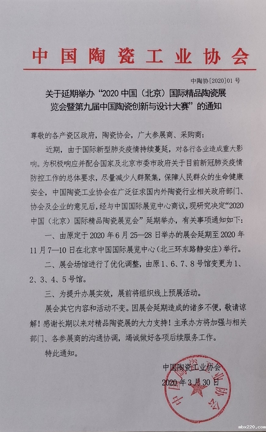 关于延期举办“2020中国(北京)国际精品陶瓷展览会暨第九届中国陶瓷创新与设计大赛”的通知