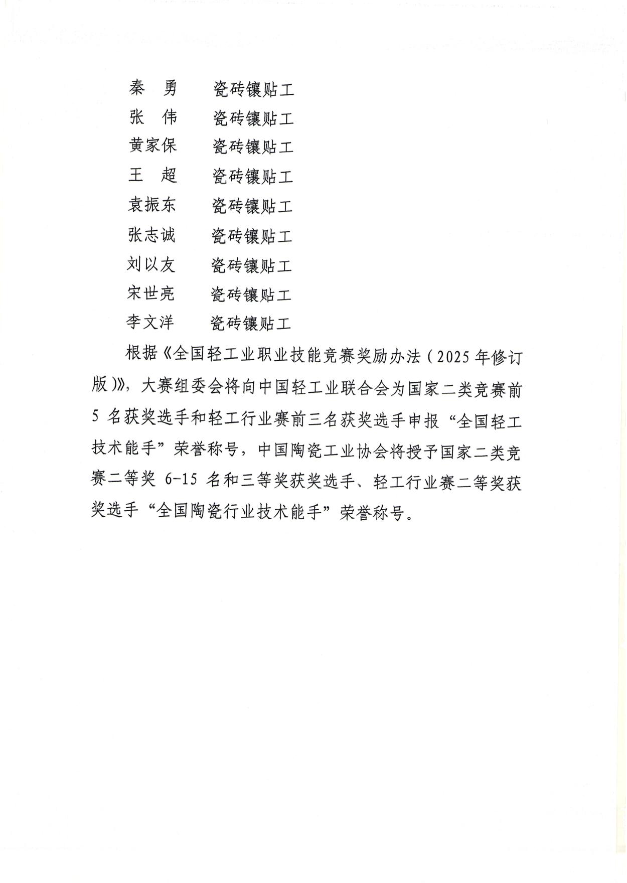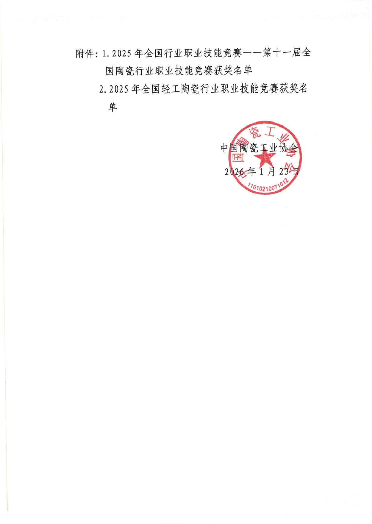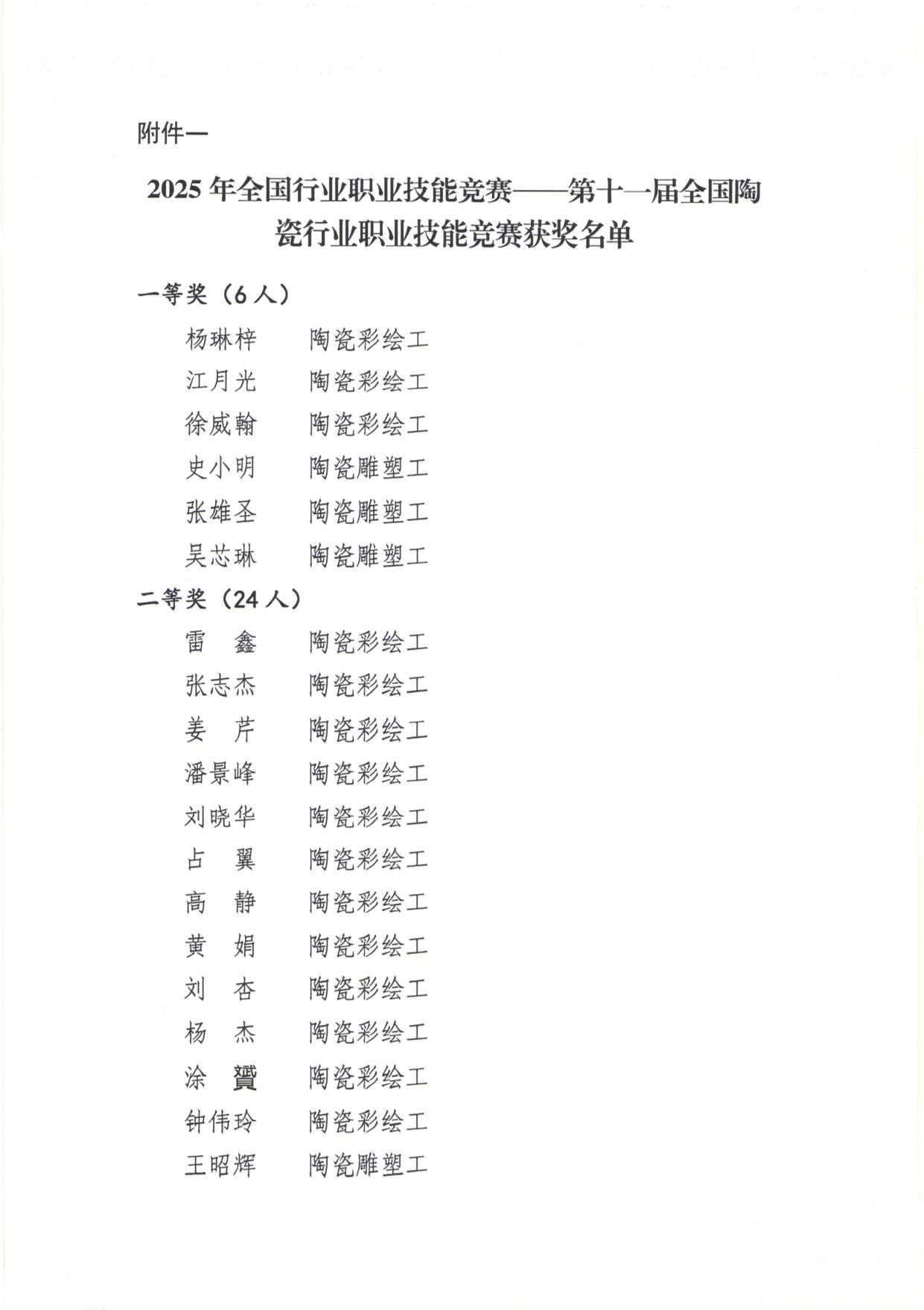 关于公布2025年全国行业职业技能竞赛-第十一届全国陶瓷行业职业技能竞赛暨2025年全国轻工陶瓷行业职业技能竞赛总决赛获奖名单的通知