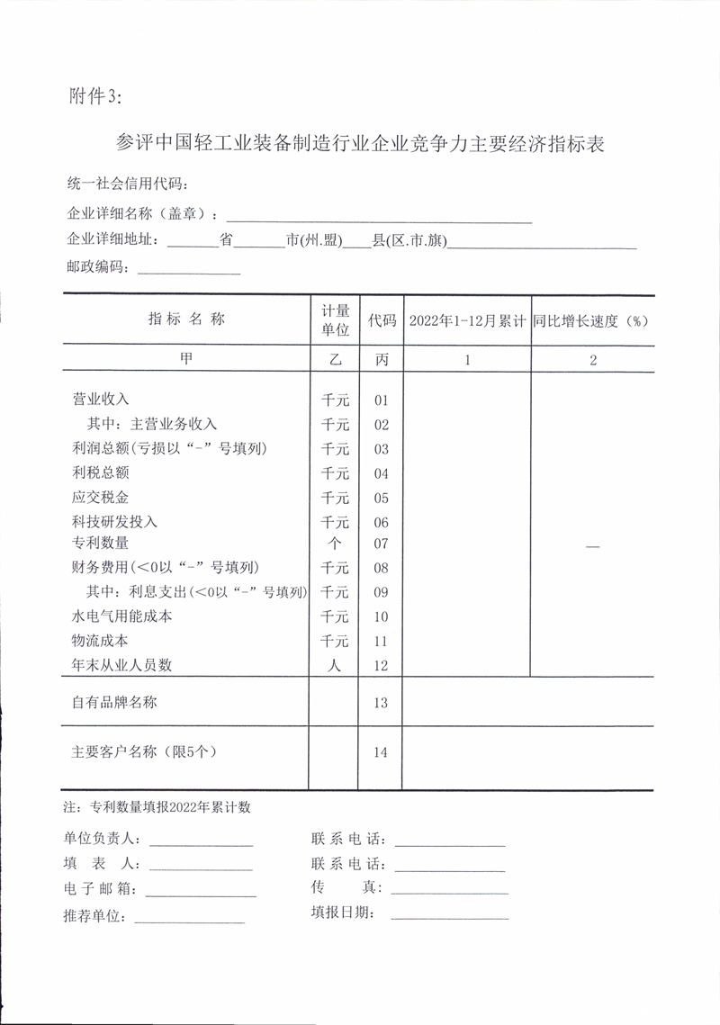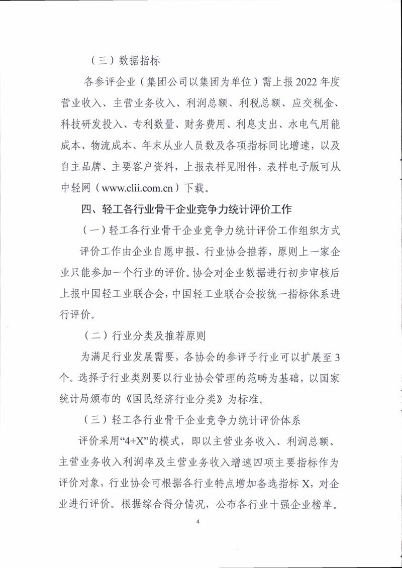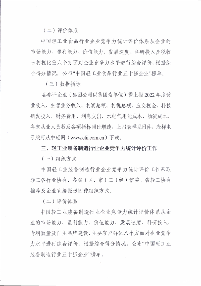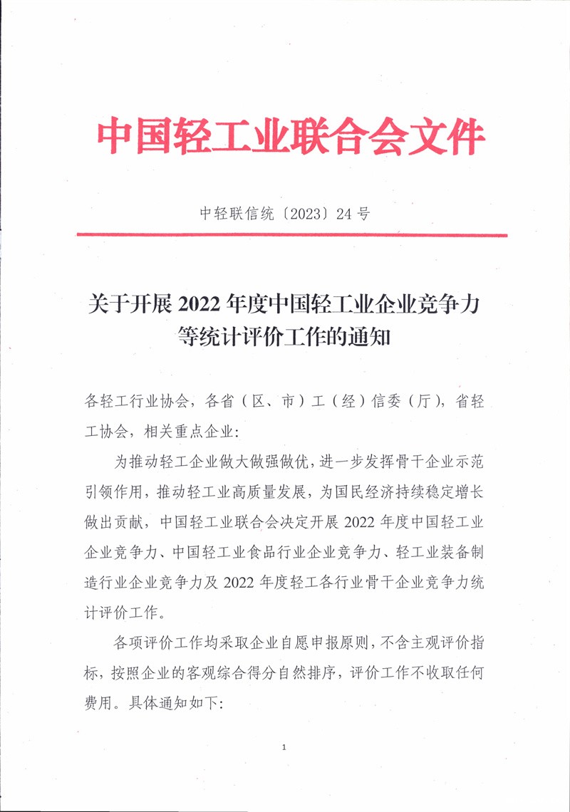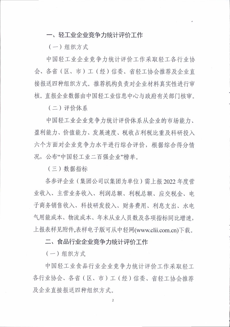 关于开展 2022 年度中国轻工业企业竞争力等统计评价工作的通知