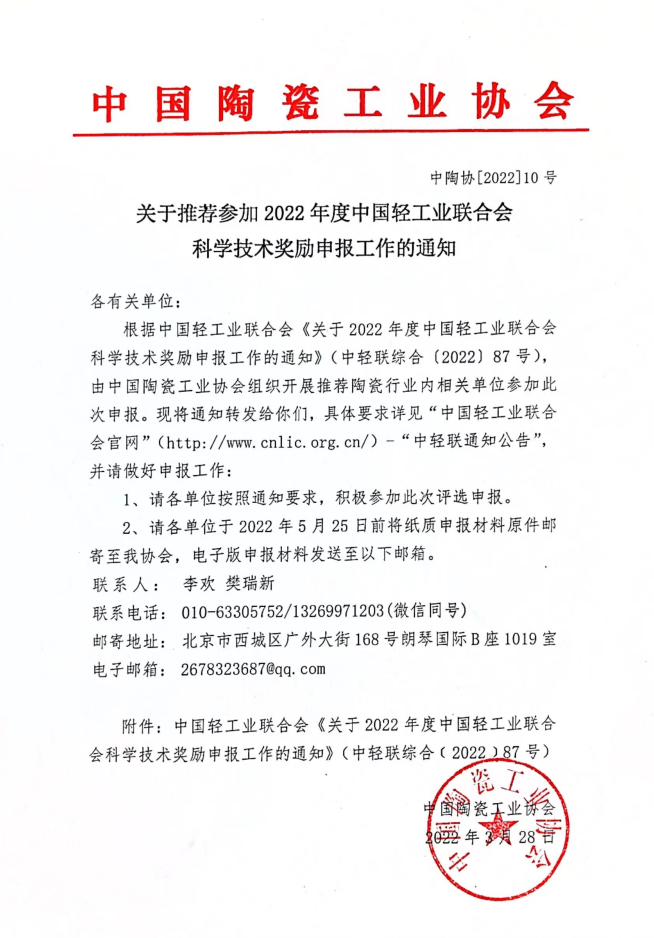 根据中国轻工业联合会《关于2022年度中国轻工业联合会科学技术奖励申报工作的通知》(中轻联综合〔2022〕87号),由电脑版taptap官方组织开展推荐陶瓷行业内相关单位参加此次申报。现将通知转发给你们,具体要求详见“中国轻工业联合会官网”(http://www.cnlic.org.cn/)-“中轻联通知公告”,并请做好申报工作: