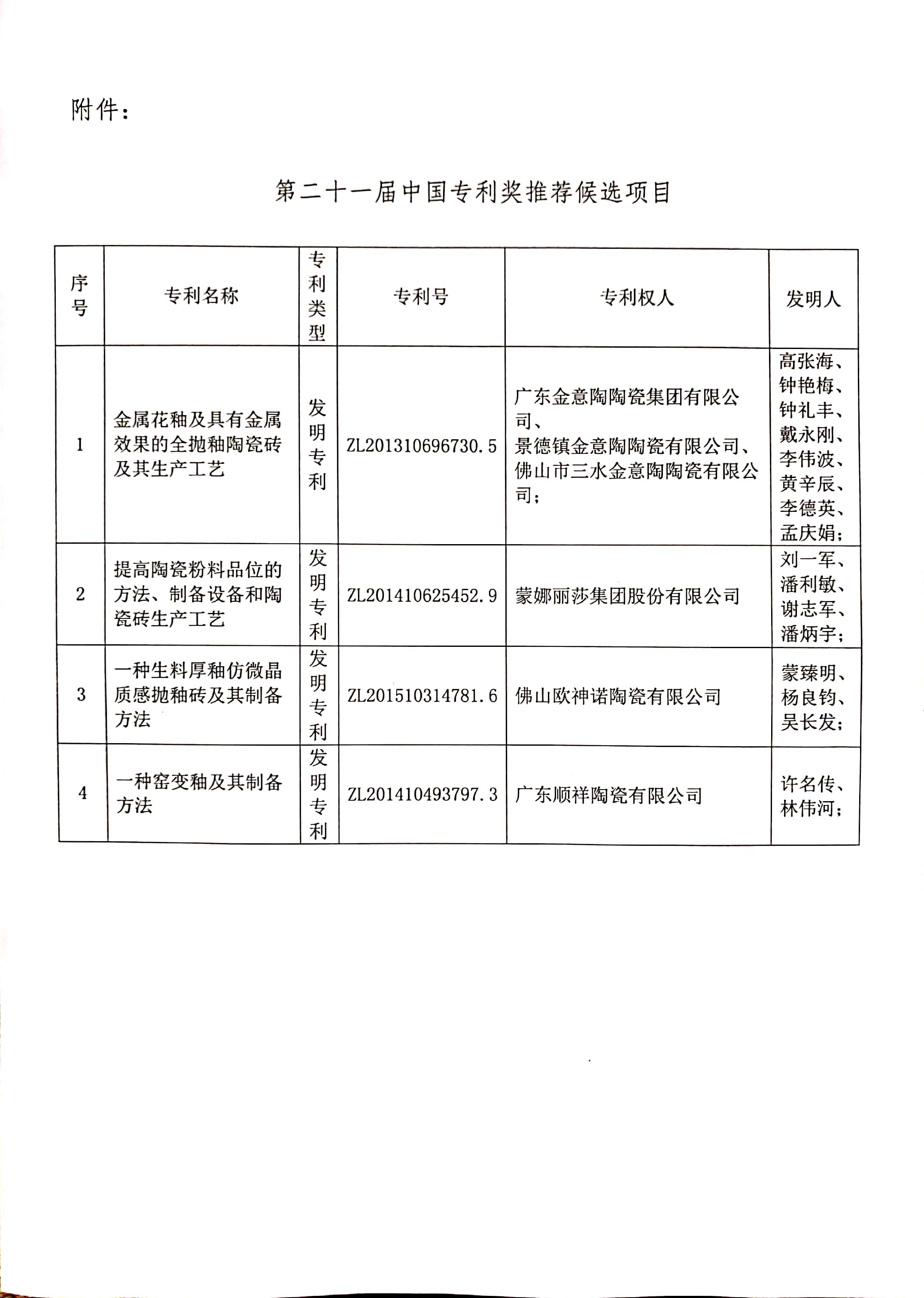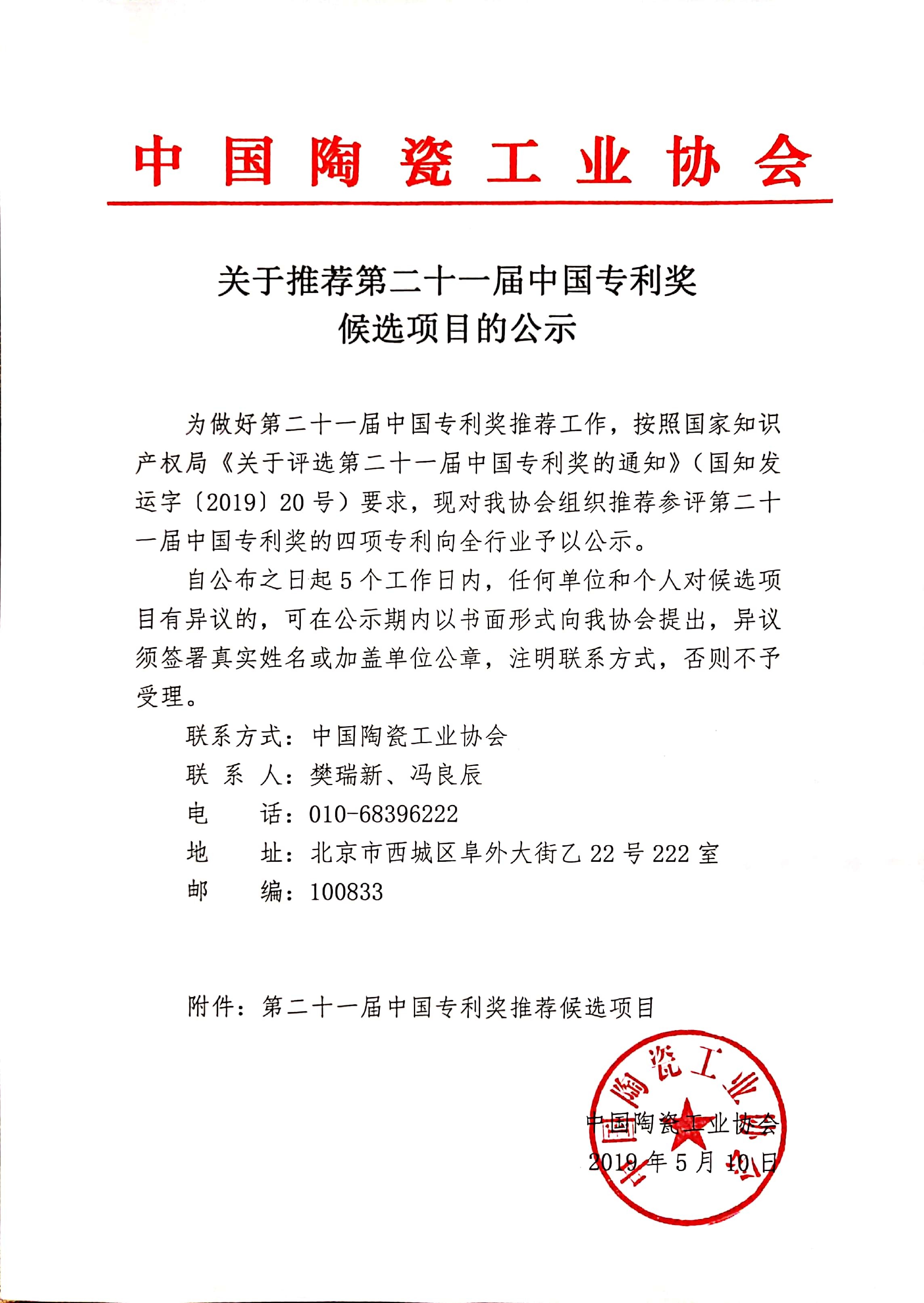 关于推荐第二十一届中国专利奖 候选项目的公示