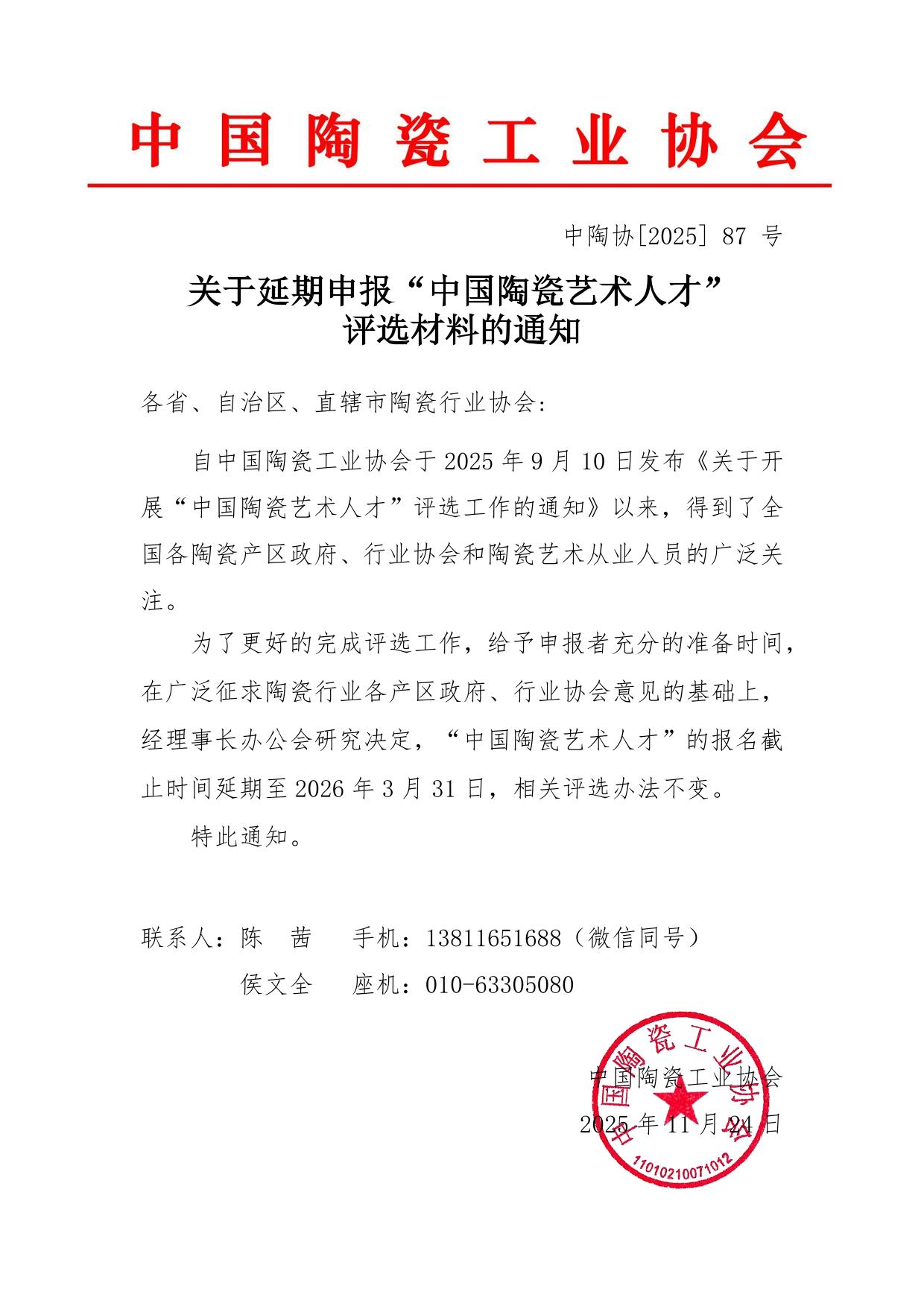 关于延期申报“中国陶瓷艺术人才”评选材料的通知