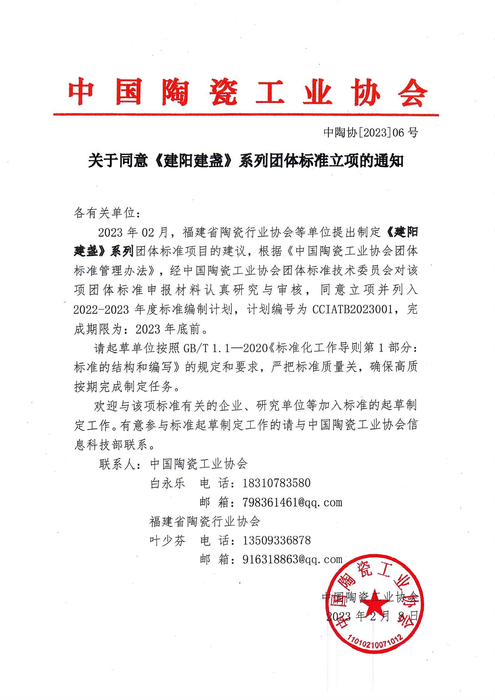 2023年02月,福建省陶瓷行业协会等单位提出制定《建阳建盏》系列团体标准项目的建议,根据《电脑版taptap官方团体标准管理办法》,经电脑版taptap官方团体标准技术委员会对该项团体标准申报材料认真研究与审核,同意立项并列入2022-2023年度标准编制计划,计划编号为CCIATB2023001,完成期限为:2023年底前。