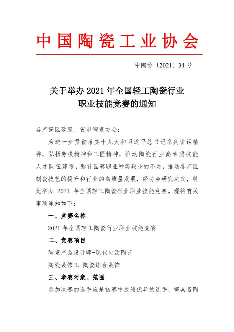 为进一步贯彻落实十九大和习近平总书记系列讲话精神,弘扬劳模精神和工匠精神,推动陶瓷行业高素质技能人才队伍建设,弥补国赛职业种类较少的不足,推动各产区制瓷技艺的提升和行业的高质量发展,经协会研究决定,特此举办2021年全国轻工陶瓷行业职业技能竞赛。现将有关事项通知如下: