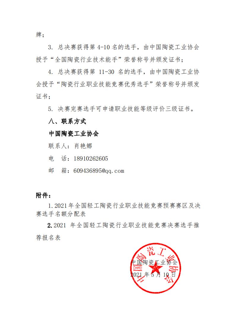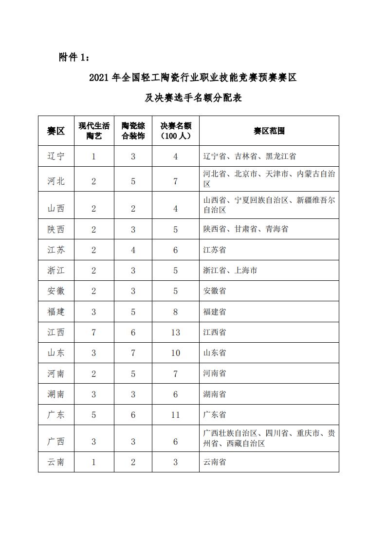 附件:1.2021年全国轻工陶瓷行业职业技能竞赛预赛赛区 及决赛选手名额分配表