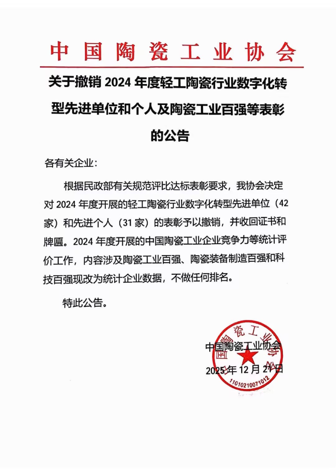 关于撤销2024年度轻工陶瓷行业数字化转型先进单位和个人及陶瓷工业百强等表彰的公告