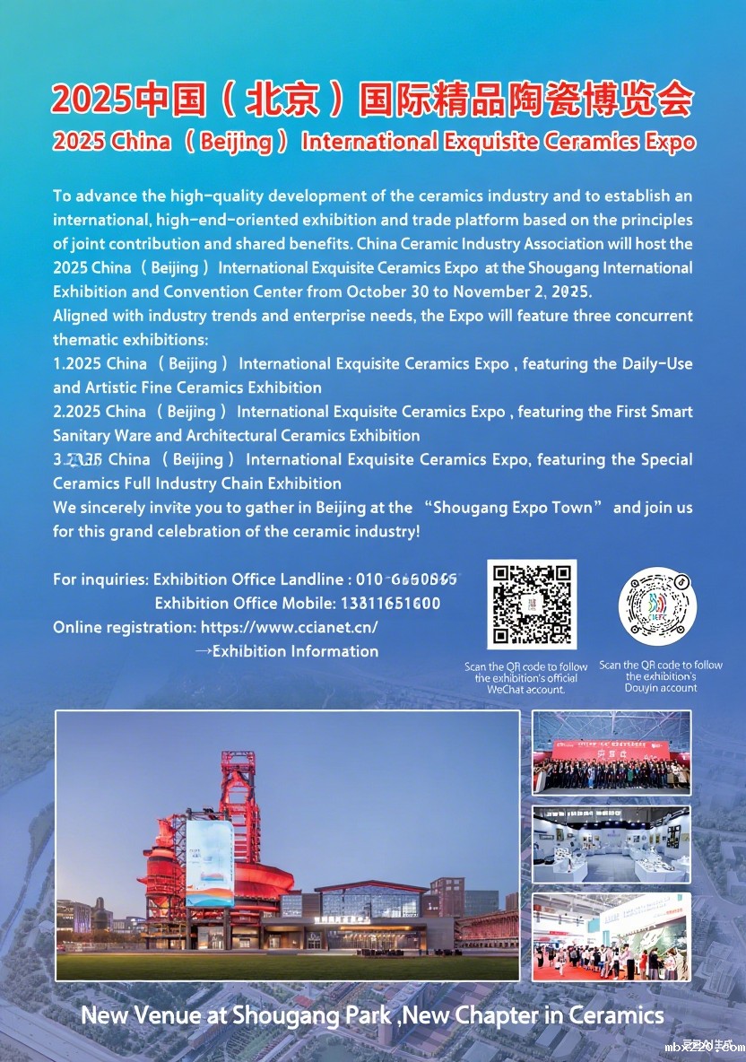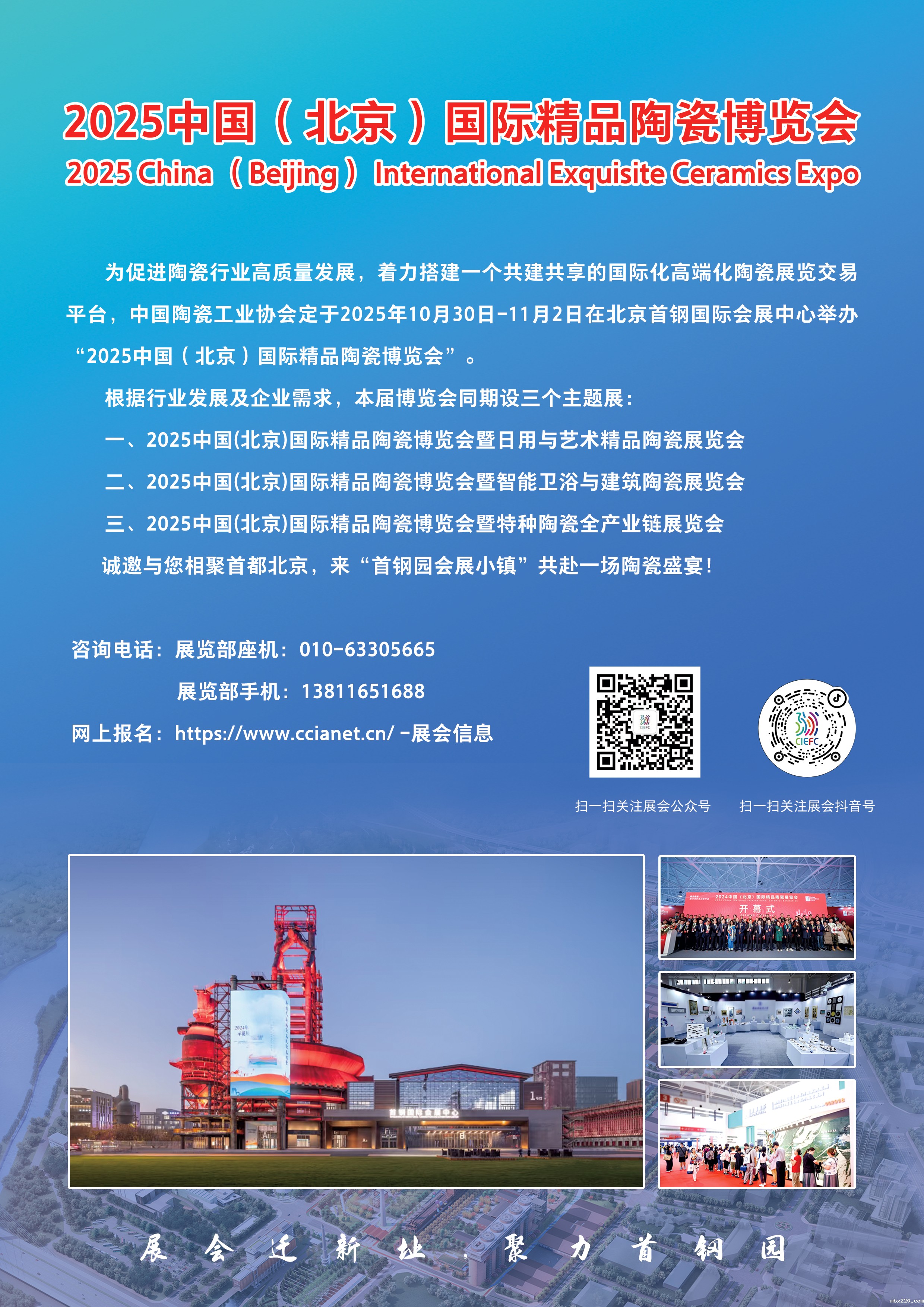 从钢铁森林到瓷艺舞台,首钢园与陶瓷博览会的相遇,是一次对产业空间价值的重新定义。当您踏入展会现场,看到的不仅是琳琅满目的陶瓷展品,更是一个行业在传统技艺与现代产业、本土文化与全球视野间寻找平衡的生动实践。10 月 30 日- 11 月 2 日,不妨赴约首钢园,在瓷片与钢铁的碰撞中,触摸中国陶瓷产业的 “未来脉搏”。