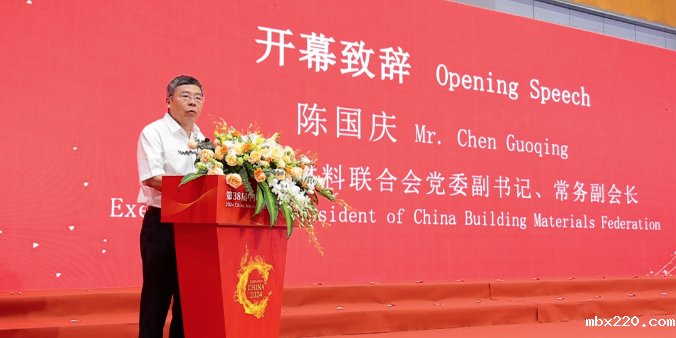 中国建筑材料联合会常务副会长、中国贸促会建材分会会长陈国庆在开幕致辞中对七家单位通力合作、共同呈现的展会盛况给予了高度认可与赞扬,对多年来一直关心和支持展会的广大参展商、参观采购商和新闻传媒表示衷心感谢。